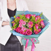 роза малиновая  – 3 шт., роза малиновая кустовая –2 шт., зелень декоративная (солидаго, салал), упаковка, лента.